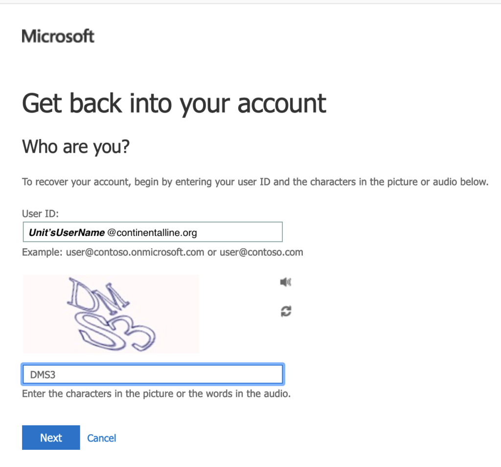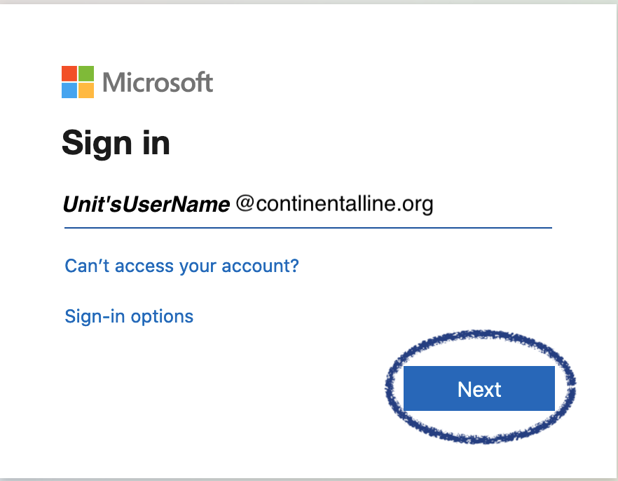 Step 2) When prompted for Email, phone or Skype, Enter your Unit’s username.